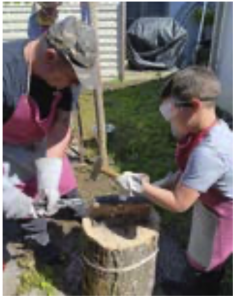 Schmieden ist mehr als nur mit dem Hammer auf ein heißes Eisen zu klopfen, diese uralte Technik der Umformung von Metallen wurde sehr anschaulich am 11.05.2025 den Familien mit Kindern (28 Teilnehmern) vorgeführt. Manuel Nill von den Muse- umsleuten der Messerschmiede erzählte die Geschichte der über 140 Jahre alten Schmiedewerkstatt. Mithilfe des Blasebalg wurde das Kohlenfeuer mit Luft versorgt und somit konnte die Temperatur des Feuers entsprechend geregelt werden. Über eine Farbskala von Rot über Gelb bis Weiß wusste der Schmied welche Temperatur das Eisen gerade besitzt. Im Verkaufsraum der Schmiede konnte die unterschied- lichsten Messer, Dolche und Stilette von ganz große bis winzig klein angeschaut wer- den. Doch nur war es höchste Zeit, dass die Kinder selbst etwas schmieden. Im Gar- ten stand eine moderne Mobile Schmiede. Ausgestattet mit Schürze, Handschuhe und Schutzbrille wurden von den Kindern die Rundmaterialien ins Feuer gelegt und nach dem erreichen der Temperatur auf dem Amboss mit dem Hammer geschmie- det. Nach mehreren Durchläufen entstand langsam eine einfache Messerform. Es folgte das Abkühlen der Messer im Wasser. Die „Rohlinge“ wurden am Schleifstein scharf geschliffen und in den Messerschaft aus Holz eingepresst.